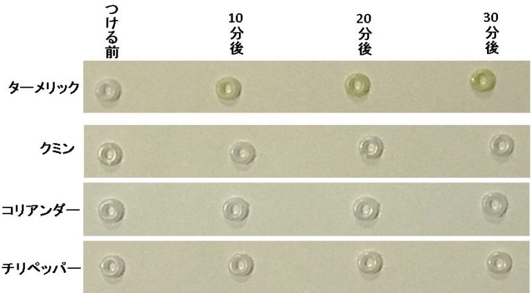 各種スパイス小さじ1/2を20mlの水に溶き、それぞれにモジュールを入れ、10分、20分、30分の条件で放置した。放置した後は30秒流水にて水洗し、着色度合いを確認した。